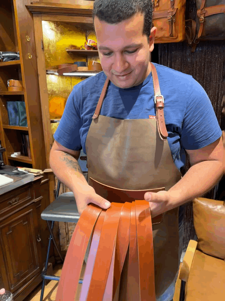 Realizzo ogni cintura con cuoio conciato al vegetale, una tradizione fiorentina che utilizza tannini naturali. Questo processo ecologico garantisce un materiale di alta qualità, che si evolve con il tempo, sviluppando una patina unica.